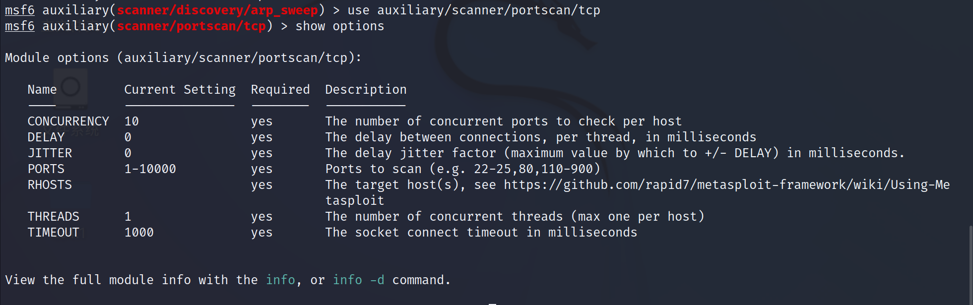 1 | use auxiliary/scanner/portscan/tcp |