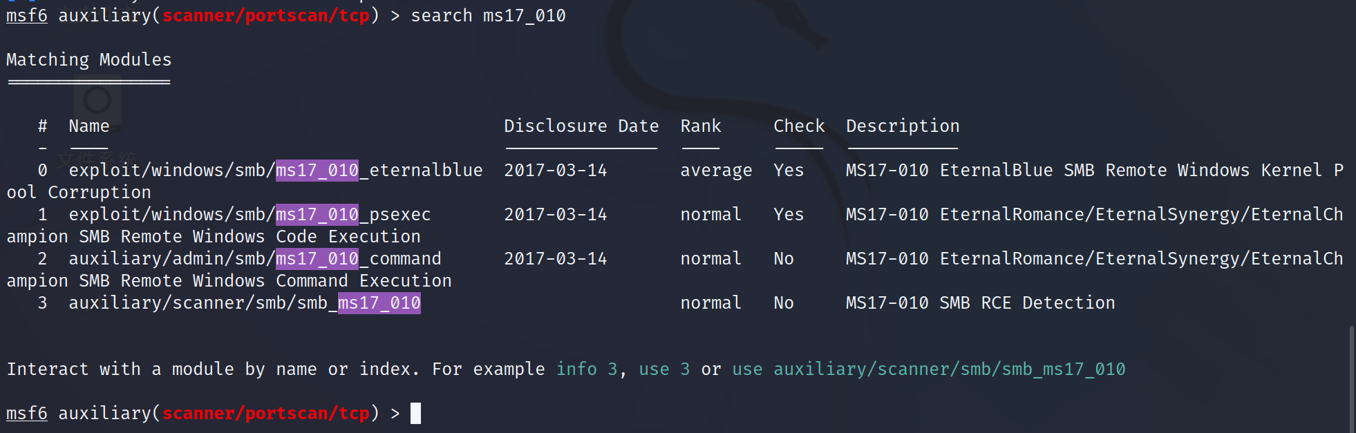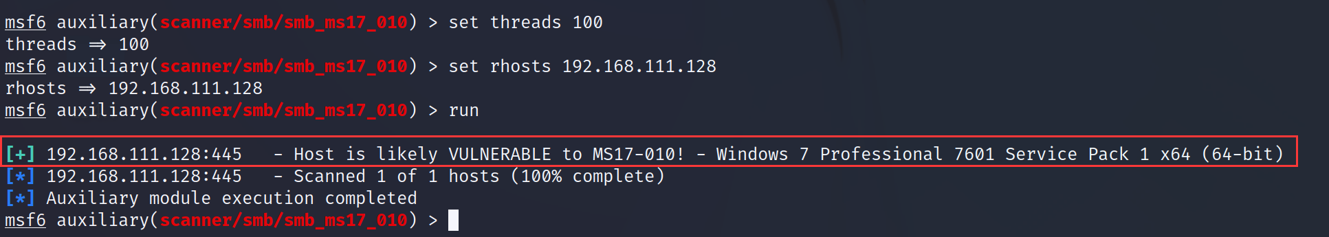 1 | use auxiliary/scanner/smb/smb_ms17_010 |